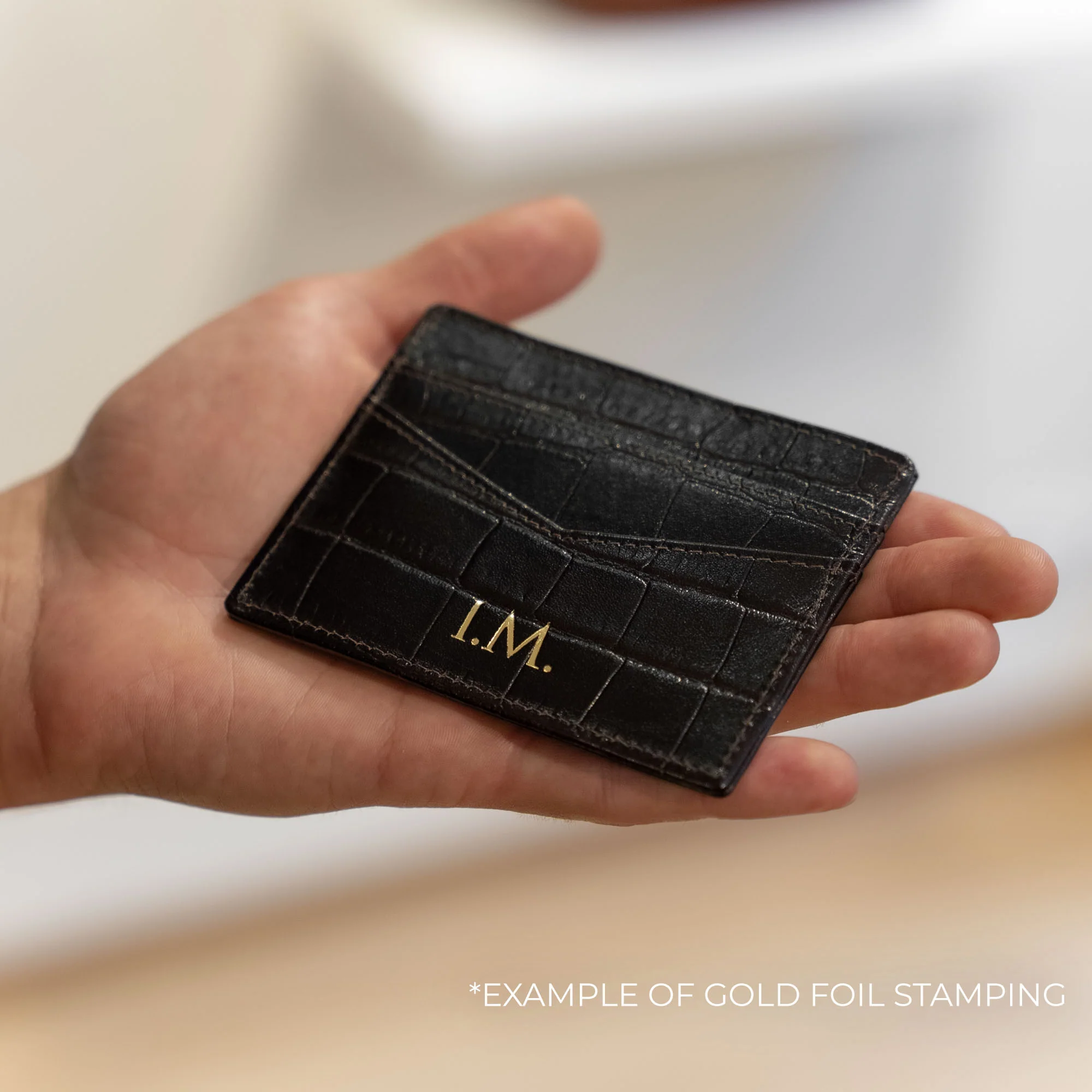This Minimalist card holder in a refined crocodile print is available in classic black and brown colors that will suit all styles. Handmade from premium full-grain aniline cow leather, it is quality you can instantly recognize. You can fit at least 6 cards in the card holder and put notes in the center compartment. The slim design allows you to carry it even in the smallest purse or handbag. Take it with you anywhere and appreciate the ease of a card holder. Personalize it with embossed initials and make it the perfect gift for yourself or a loved one. Comes in an elegant gift box.